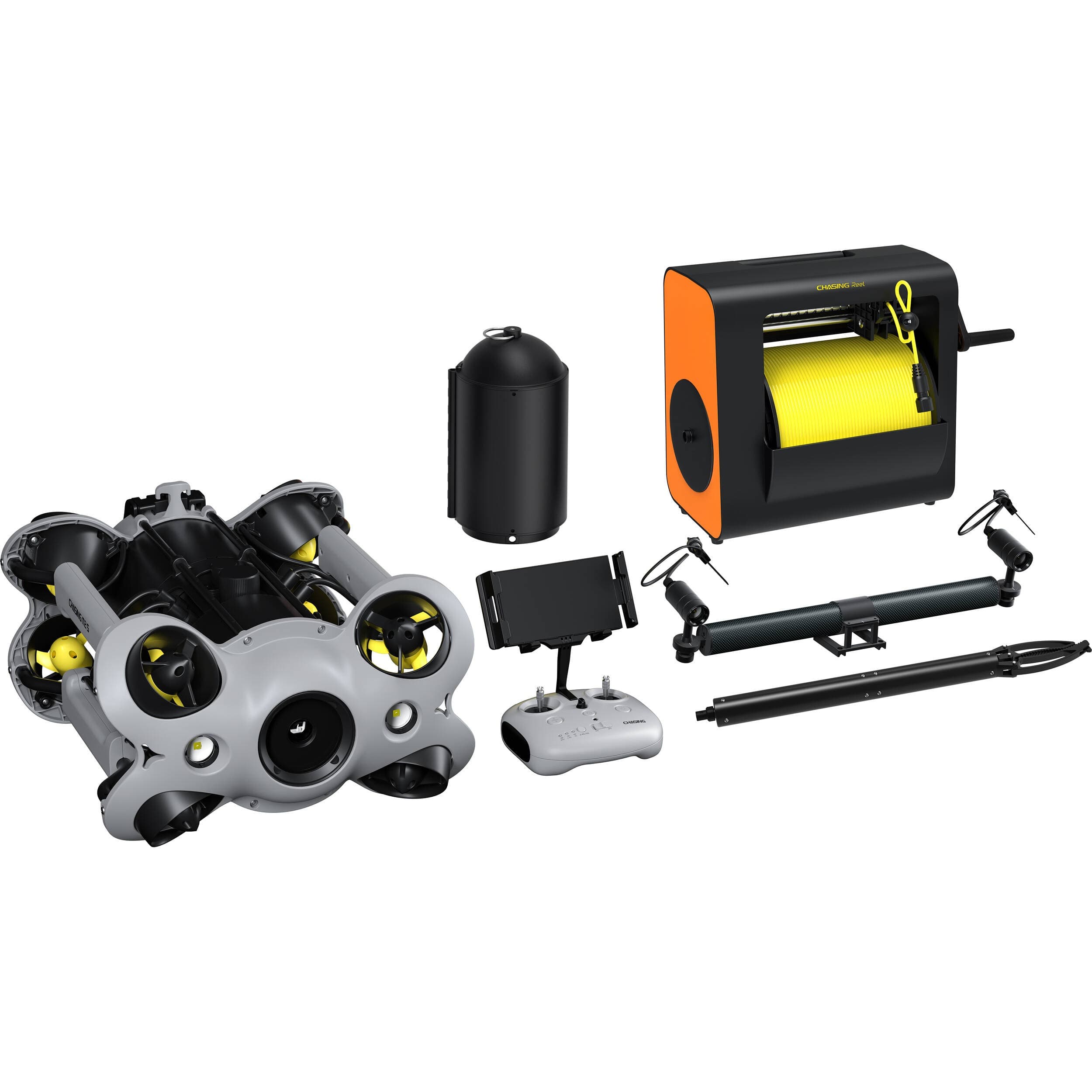 Professional underwater drone with 4K EIS camera, 8 thrusters, 150m depth rating, and swappable accessories for marine exploration.